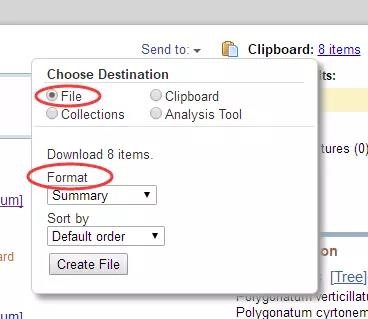 点击上图Clipboard后的记录数,可以查看保存的基因信息。在下拉菜单中,还会看到File选项,选择File,可以将保存的基因信息下载成文本文件,如果一下子要下载好几千条,会需要比较久的时间。里面的保存格式有多种,比如FASTA、GFF3,可以根据后续处理数据的需要进行选择。