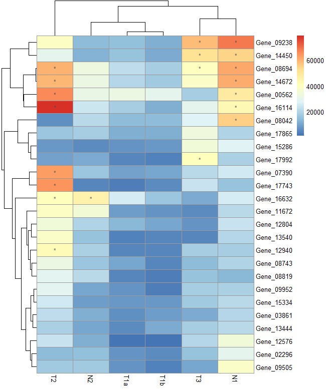 pheatmap(test, display_numbers = matrix(ifelse(test > 40000, "*", ""), nrow(test)))