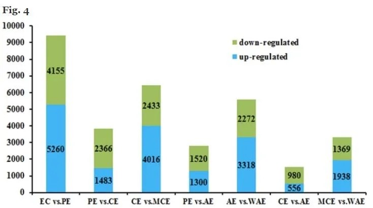 作者根据胚发育不同阶段或形态的愈伤组织取样,即胚性愈伤组织(EC)、原胚(PE)、子叶胚(CE)、异常胚(AE)、成熟子叶胚(MCE)和枯萎异常胚(WAE),共6个样品,每个样品重复3次,共测序18个转录组。该部分写作也很套路,介绍了测序数据及unigenes组装、功能注释情况。
