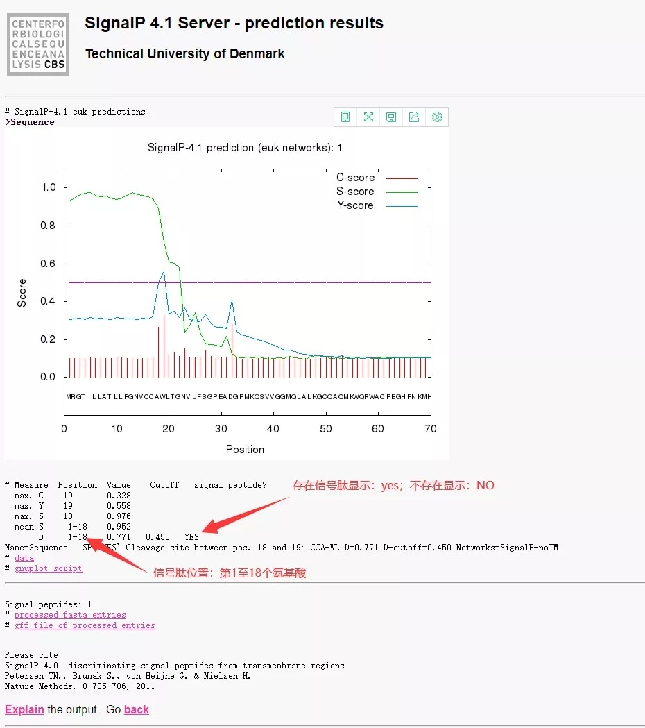 C-score (raw cleavage site score):用来区分是否为剪切位点,最高峰值为剪切位点后的第一个氨基酸(即成熟蛋白的第一个氨基酸残基);