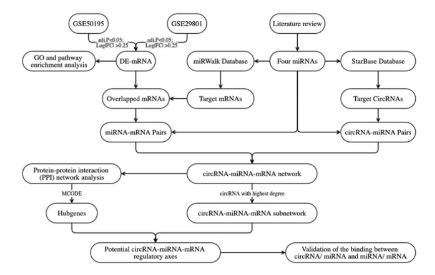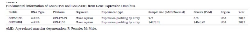 文章利用了两个GEO的表达数据集以及已知的RNA调控数据数据库,找到了与AMD相关的ceRNA,就可以发到3分以上的文章,相比肿瘤相关的数据挖掘简单很多。