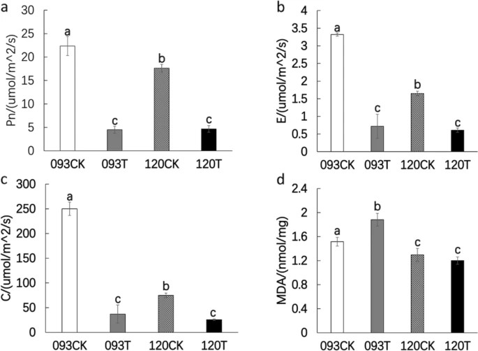 a. 测量了冷胁迫对照处理3天后093CK、093T、120CK和120T四组植株的净光合速率 (Pn)、蒸腾速率 (E) 、气孔导度 (C)和MDA浓度。
