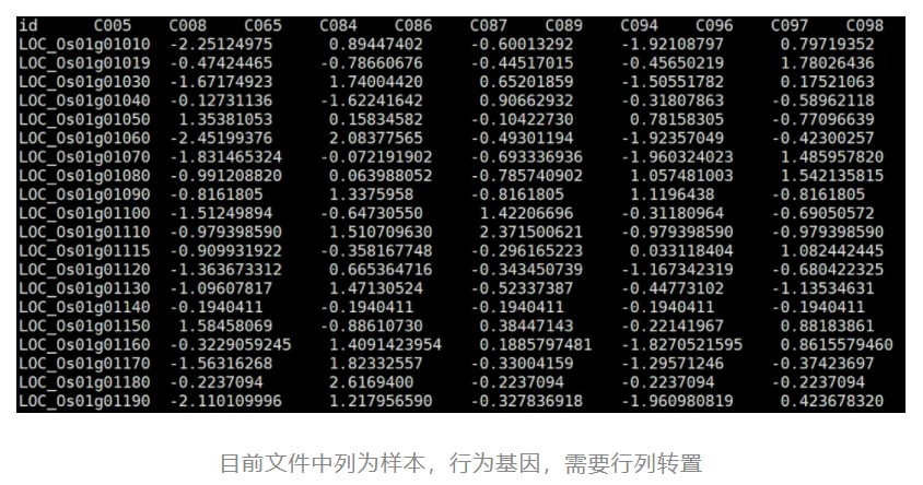 使用时只需要提供样本的基因表达量文件,文件中每一行为一个样本,每列为一个基因,我们通常获得的表达量的矩阵是每行是一个基因,每列是一个样本,所以要对数据进行转置,转置之前的表达量文件格式如下: