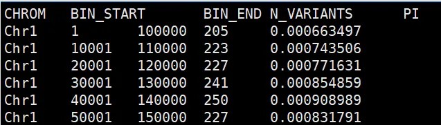 结果文件:结果文件一共5列,分别对应着染色体ID、起始位置、终止位置、变异数目、π值