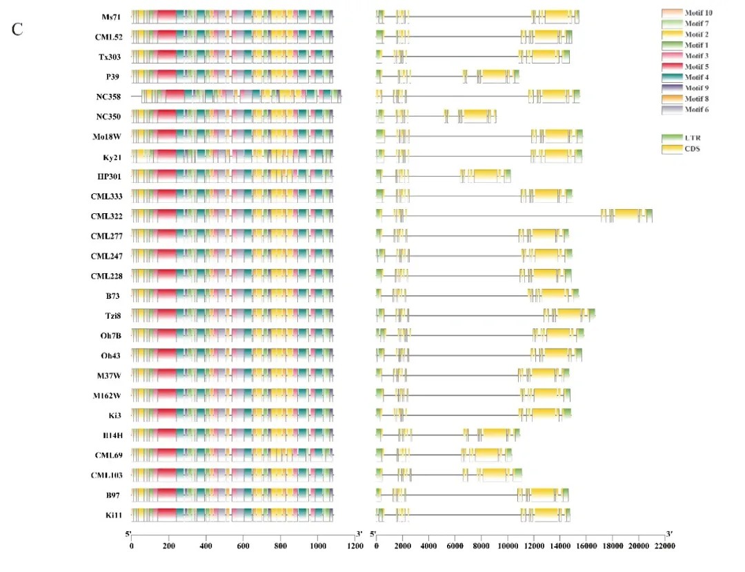 02-3. 结构变异分析选取B73基因组作为参考基因组进行建库,随后采用ANNOVAR对结构变异进行注释得到玉米结构变异文件。从变异文件中提取数据,得到ARF2、ARF3、ARF4和ARF25在结构变异和非结构变异情况下表达量存在显著差异。(图A)选取参考基因组B73和变异程度最高的Ki3分别进行保守基序分析(图B),表明结构变异对ARF的保守结构域有显著影响。