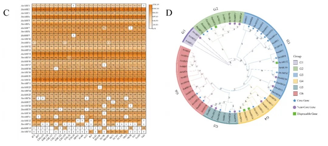 将玉米和拟南芥的ARF基因结构域序列构建树,参考doi: 10.1186/1471-2164-12-178文章将树分为6个亚家族,G1-G6。如图D,有的亚家族中全是核心基因、不同亚家族包含的ARF成员数目不相同。