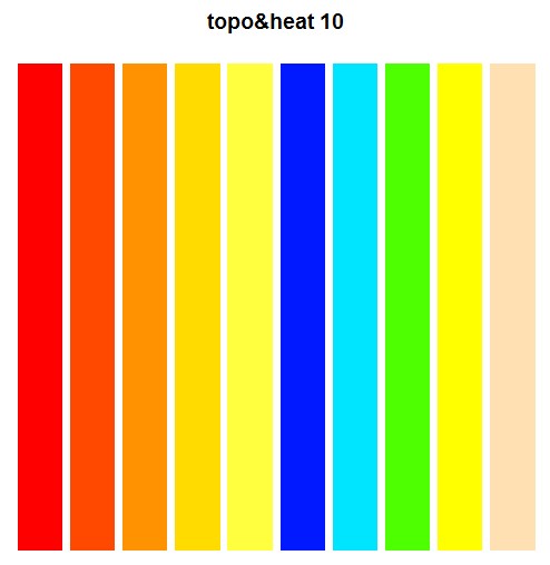dev.off() c<-c(a[c(1,3,5,7,9)],b[c(2,4,6,8,10)]) barplot(rep(1,times=10),col=c,border=c,axes=F,main="topo&heat 10")