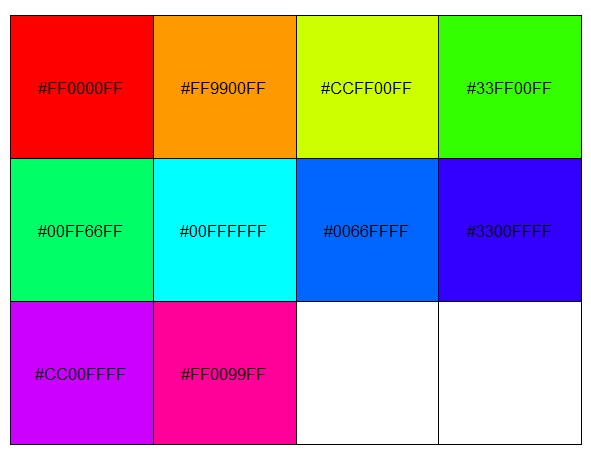 rainbow(10) [1] "#FF0000FF" "#FF9900FF" "#CCFF00FF" "#33FF00FF" "#00FF66FF" "#00FFFFFF" [7] "#0066FFFF" "#3300FFFF" "#CC00FFFF" "#FF0099FF"