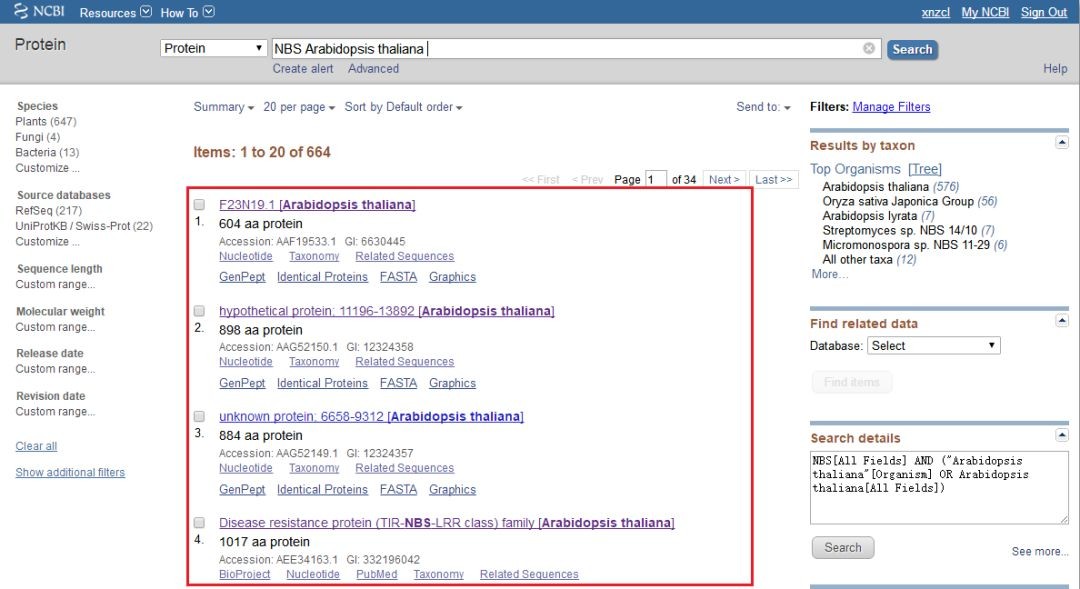 如下图所示,从NCBI查找一个含有所需要的蛋白保守结构域的蛋白:在红框所示选择蛋白、输入名称+物种然后搜索。