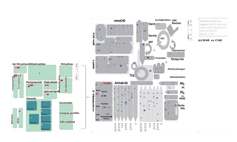 此外,利用MapMan对这些DETs进行代谢通路分析,重点针对旱作条件下的DETs在代谢和二级代谢合成进行了分析,部分结果见下图。