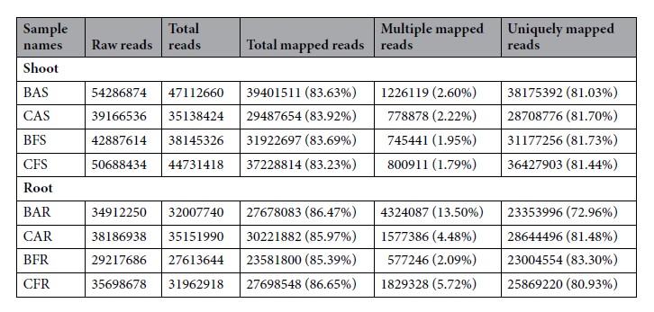 测序样品对应:BPT 5204 Aerobic Shoot,BAS;CR Dhan 202 Aerobic Shoot,CAS;BPT 5204 Anaerobic Shoot,BFS;CR Dhan 202 Anaerobic Shoot,CFS;BPT 5204 Anaerobic Root, BFR;BPT 5204 Aerobic Root ,BAR;CR Dhan 202 Aerobic Root, CAR;CR Dhan 202 Anaerobic Root ,CFR。