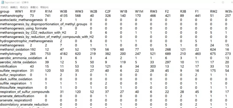 功能表faprotax1,基于这个表就可以进行样本和注释功能的图片绘制(最好先进行筛选)。