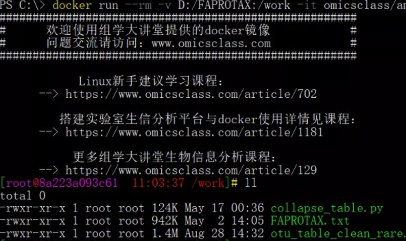 docker run --rm -v D:/FAPROTAX:/work -it omicsclass/ampliseq-q1:latest #进入虚拟机
