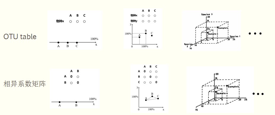 distance based表示:特殊转换后的相异系数矩阵,bray curtis距离、Jaccard 距离,Unifrac距离矩阵