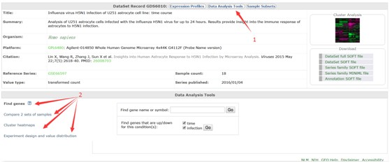 而针对每一个GDS数据,都可以通过网站在线工具:Data Analysis Tools 实现一些基本分析,包括差异分析、聚类分析等(见下图)。小编将以GDS6010对应都18个样品芯片数据为例给大家演示分析过程。