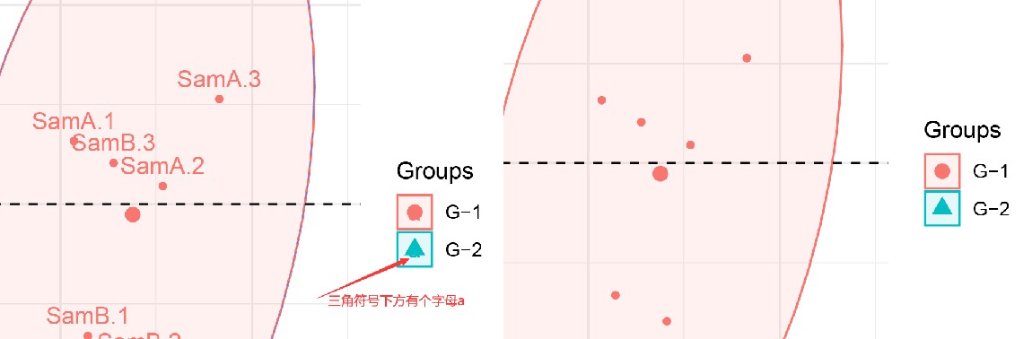 在使用FactoMineR和factoextra包绘制PCA图时,如果图中每个样本显示样本名,那么该图的图例中,图形符号下面会有字母,如下图左;如果图中不显示样本名,那么图例符号下面就不会有字母,如下图右;