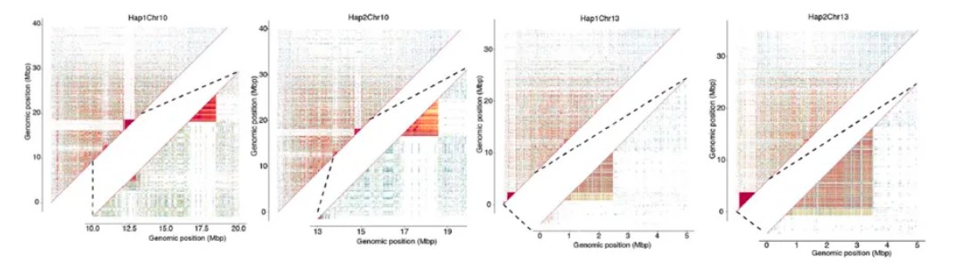 基因组组装:作者采用‘Baltico’的新鲜叶片进行了4种测序,将ul ONT、HiFi、和Hi-C数据投入到hifiasm这个软件中进行初步的组装。删除细胞器基因组和一些可能存在的污染情况。用3D-DNA和 JUICER借助hi-c数据将基因组挂载到染色体水平,之后发现两个单倍型分别存在14个gaps,然后用ONT测序数据对目前的基因组进行补洞,把gap给填充了。最后再使用pilon这个软件抛光填充后的基因组也就是无gap的‘Baltico’基因组。