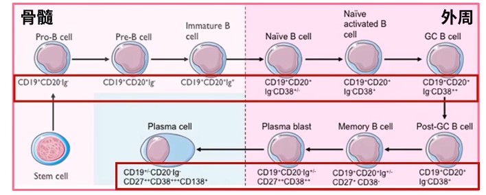 初始B细胞 naive B (Bn cells)、记忆B细胞memory B (Bm)、增殖B细胞(proliferative B cells),生发中心B细胞germinal center B (Bgc)、循环B细胞(cycling B cells)和抗体分泌B细胞(antibody-secreting cells ASC)