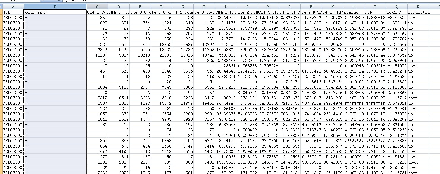 一组差异表达分析结果,包括基因的名称,基因的表达量已经差异分析结果,上下调信息如下,所以我只需要第一列可以做venn图,最后一列做数量统计: