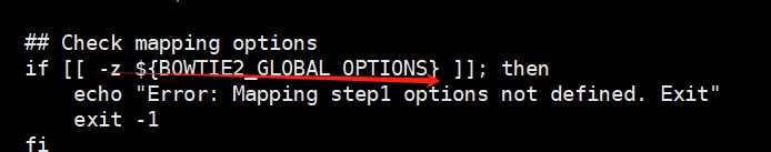 到这个sh文件里面去查看,发现报错是由于config文件里面的BOWTIE2_GLOBAL_OPTIONS变量缺失: