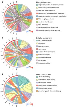 针对ceRNA网络中的mRNA进行GO,KEGG的功能注释和分析。从中可以发现一些基因跟细胞周期,P53 信号途径,癌症相关miRNA等通路相关。