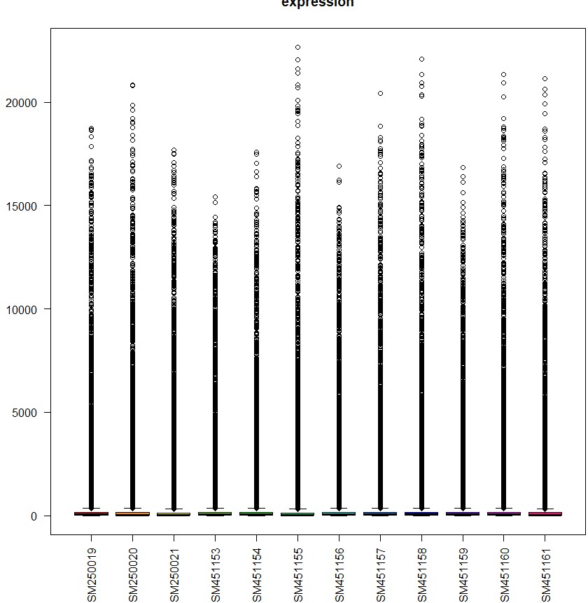利用boxplot(exprSet,col= cols , main ="expression", las =2)得到上图结果,通过加入outline= F,可以纠正错误。