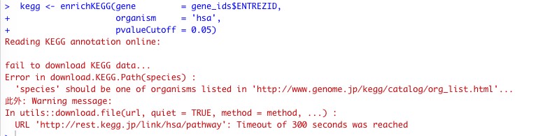 按照课程里的代码用R分析TCGA数据差异基因的KEGG富集,发生报错