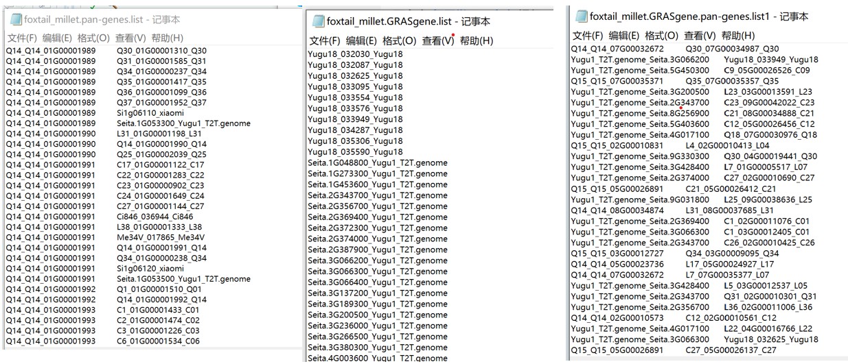 老师,我的泛基因组列表final.last.gene.pair.txt(当时发您参考基因组名字Yugu1_T2T.genome有误),但在家族成员存在缺失分析时,awk 'FNR>1{print $1"\t"$2"_"$3}' final.last.gene.pair.txt > foxtail_millet.pan-genes.list 整理格式时,已经均进行了调整(名字纠正),但经过perl /work/scripts/PAV_list.pl -pangenel foxtail_millet.GRASgene.pan-genes.list -spid new_id2.txt -unigenel foxtail_millet.GRASgene.uniq.list -fam GRAS , 生成的PAV_gene.list 还是996个成员,Yugu1_T2T.genome每个基因单独一个编号,生成的Fam_gene.list也是,后面无法做结构变异与基因结构和保守结构域分析,麻烦老师帮忙看看哪里还有问题?谢谢!
