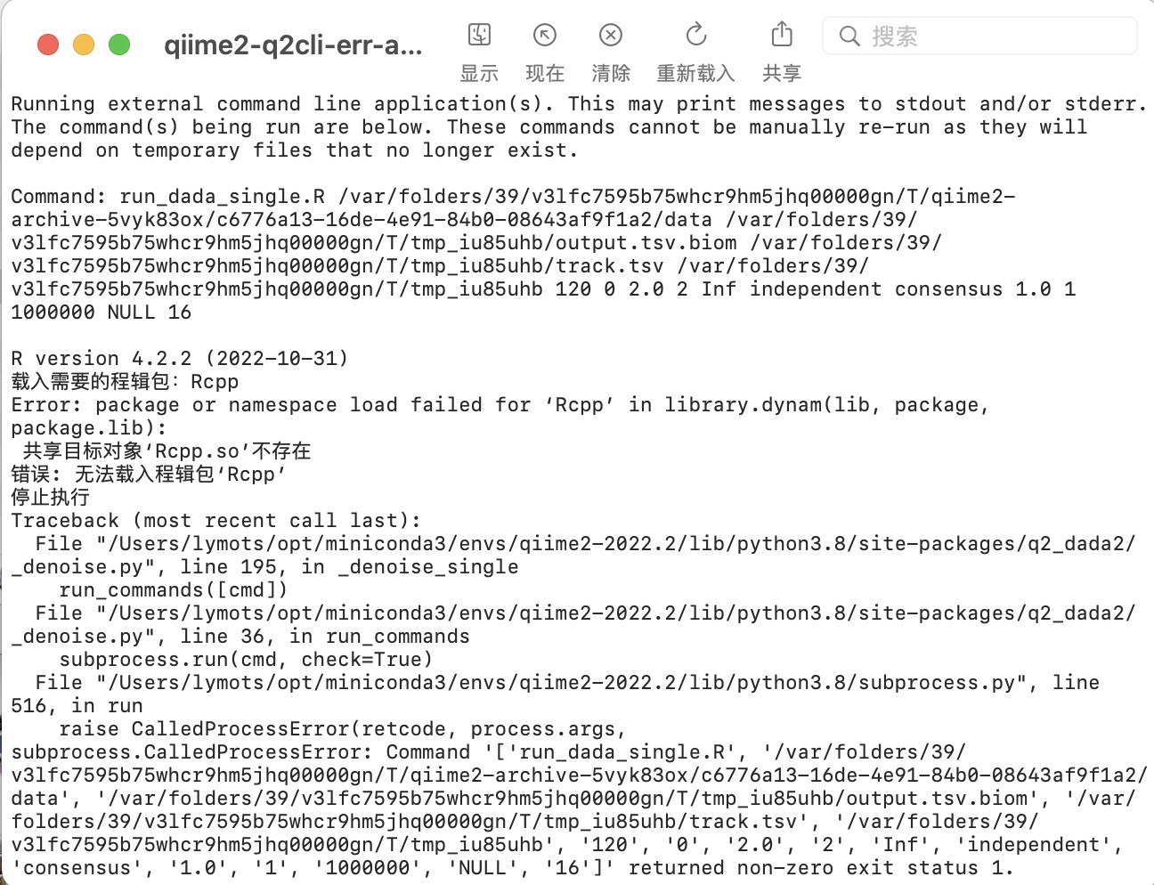 在mac上使用qiime2调用dada2报错,请问老师如何解决?