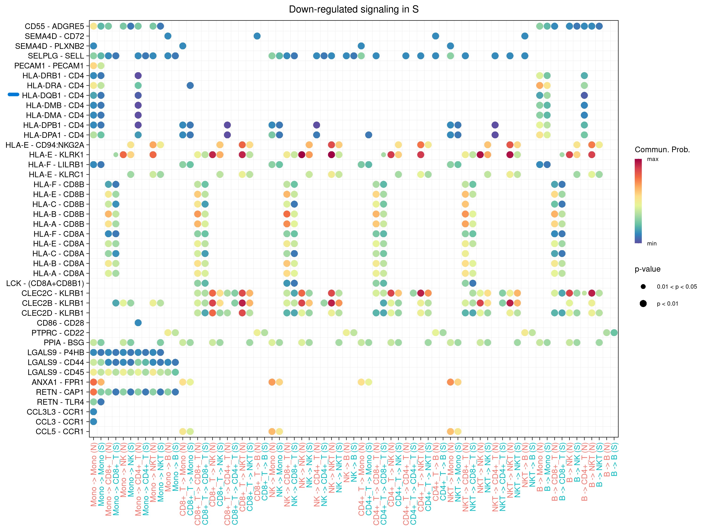 用的课程里提供的代码跑的,出来的这个图为什么最后多了没有对应的一列,而且这里应该展示的是在S组中上调的signaling,但是为什么感觉N组的圆圈的颜色比S组的更深呢?而且为什么HLA-DQB1和CD4在上调和下调中都出现了呢?
